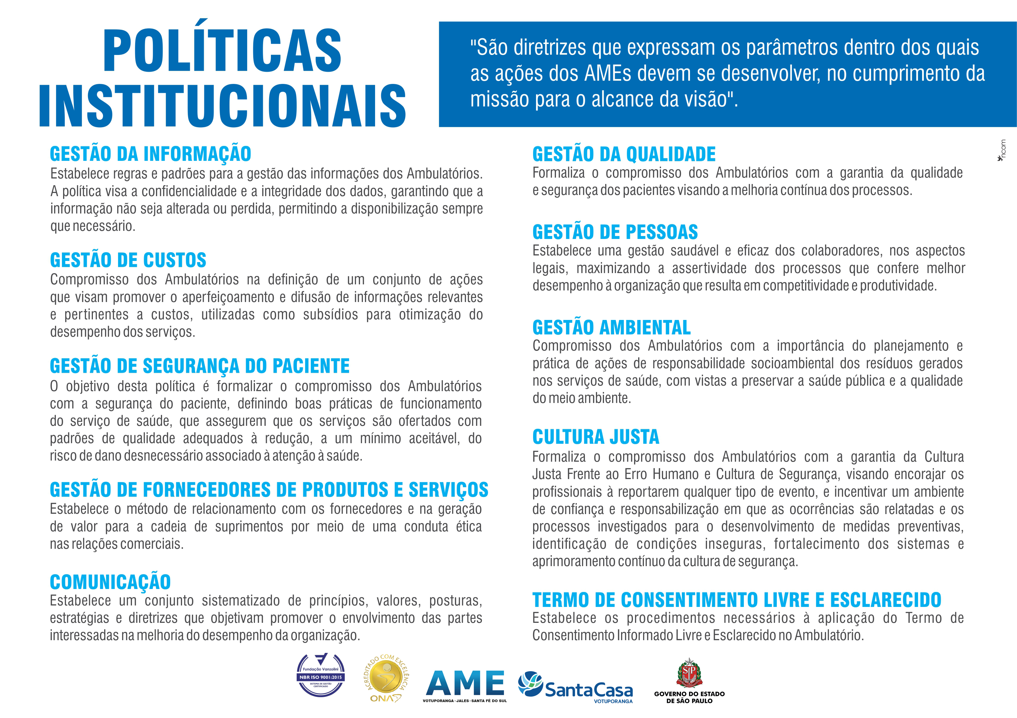 Os Ambulatórios Médicos de Especialidades de Votuporanga, Jales e Santa Fé do Sul, têm como Política de Qualidade atender as necessidades de seus clientes, com o compromisso de melhorar continuamente a qualidade dos serviços e a eficácia do sistema de gestão da qualidade, objetivando a Segurança do Paciente, a Responsabilidade, Humanização e a Gestão dos Riscos.